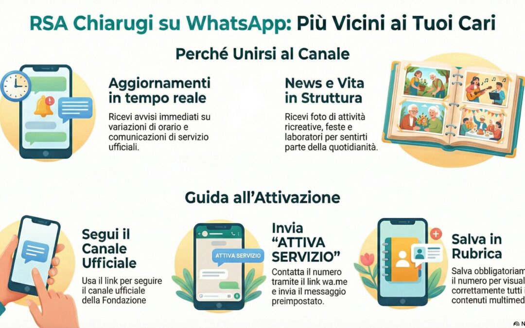 La RSA Chiarugi di Empoli è lieta di annunciare l’introduzione di un nuovo canale WhatsApp per favorire la comunicazione con i familiari degli ospiti.